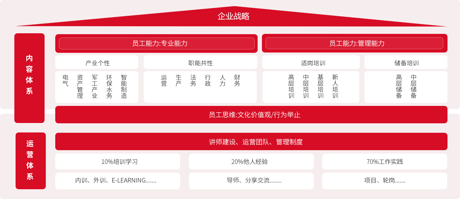 以组织能力的员工能力、员工思维及员工治理为培训内容,并依托于讲师建设、运营团队、管理制度以及混合式的学习方式作支撑。